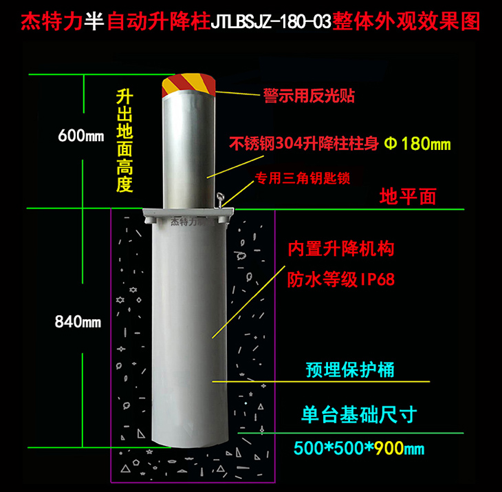 3、警示方式:升降柱的表面有50mm的反光識(shí)別帶作為警示,能夠被過往車輛的駕駛員明顯識(shí)別。